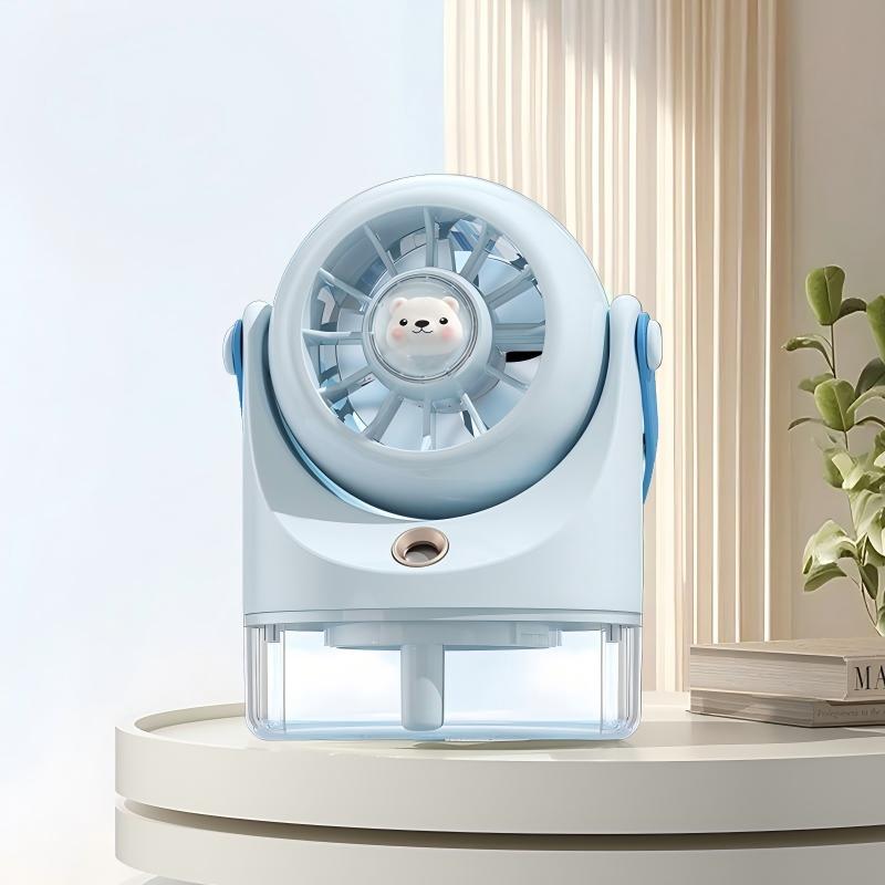 Meet our adorable 2-in-1 mist desktop fan, the perfect solution for beating hot, dry summer days. Combining powerful cooling with continuous humidification, this cute fan features a charming cartoon bear design, adjustable angle, and rechargeable battery, making it your go-to for staying cool and comfortable at home, in the office, or on the go. Available in fresh blue and soft pink, it’s as stylish as it is functional.