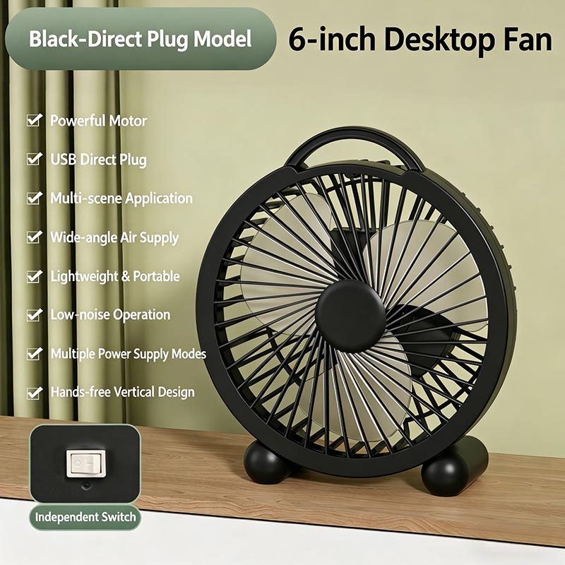 "The 6-inch black fan is a game-changer for my home office. It cools my entire workspace, and the independent switch is super convenient."